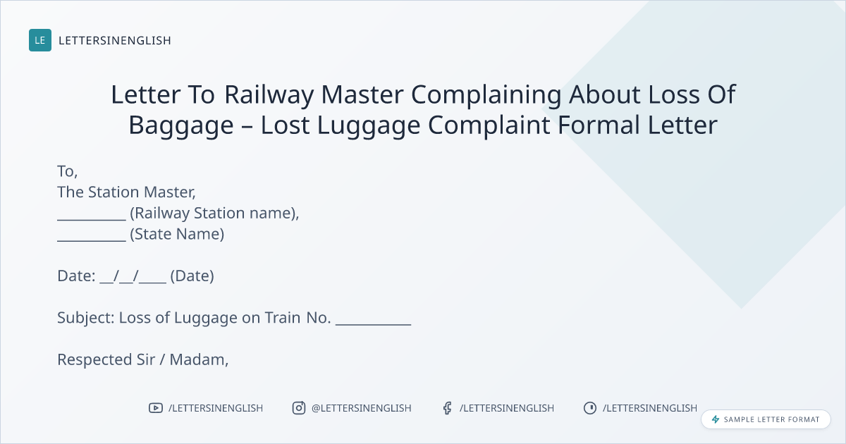 Letter To Railway Master Complaining About Loss Of Baggage – Lost Luggage Complaint Formal Letter