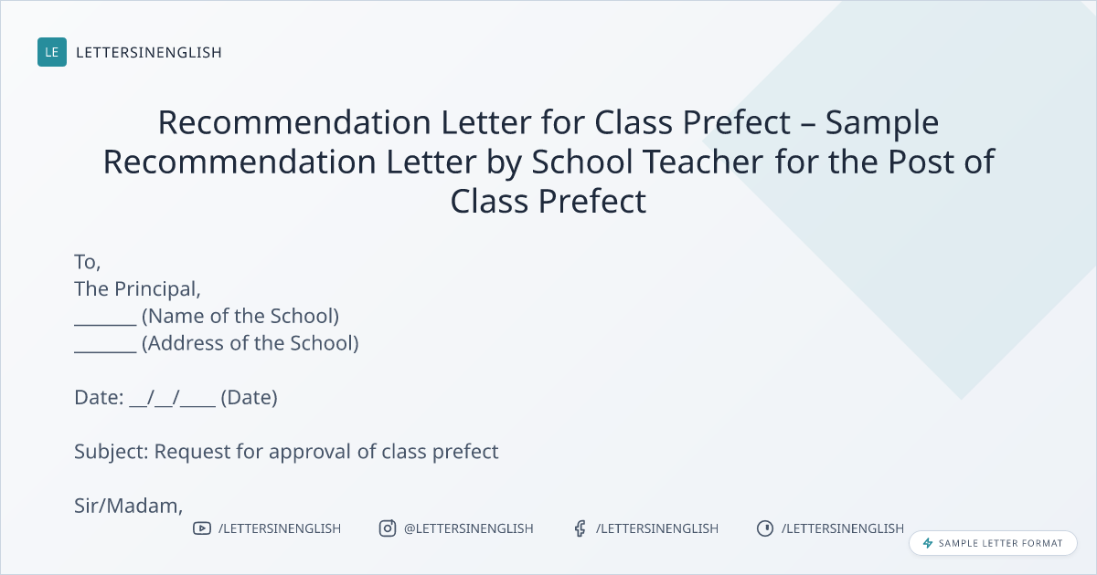 Recommendation Letter for Class Prefect – Sample Recommendation Letter by School Teacher for the Post of Class Prefect