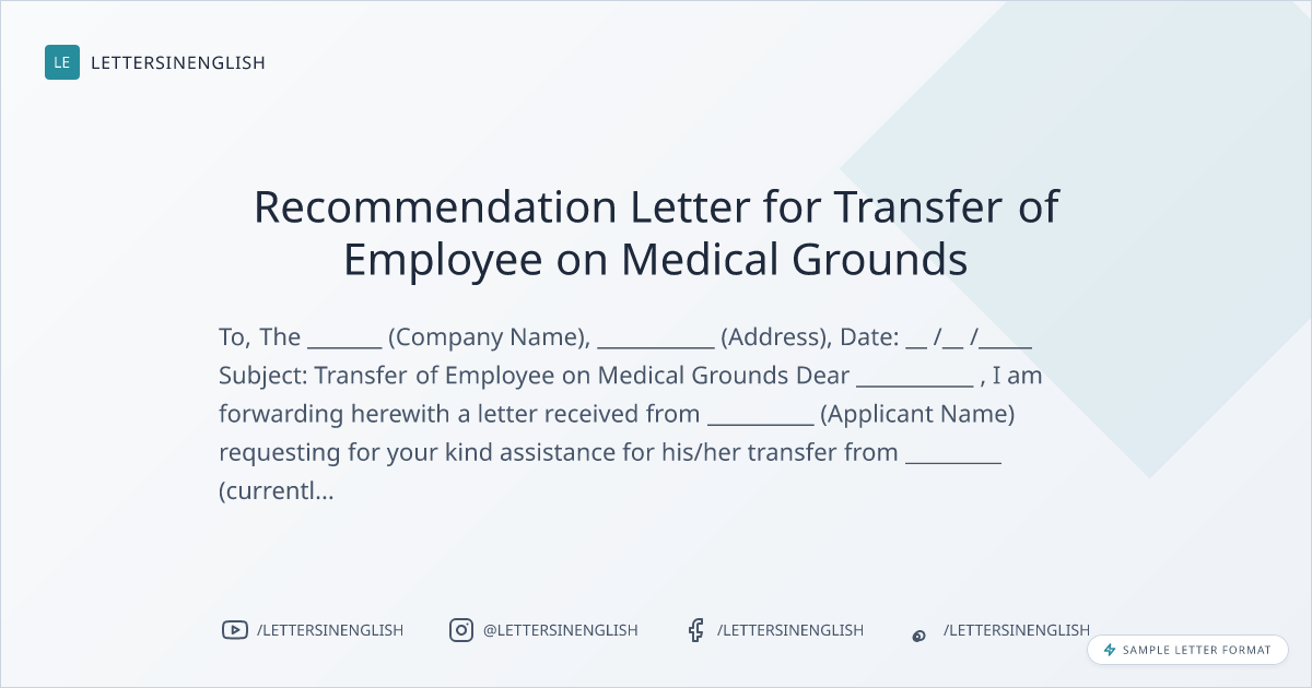 Sample Letter for Transfer of Employee on Medical grounds - Recommendation Letter for Employee Transfer Due to Medical Reasons