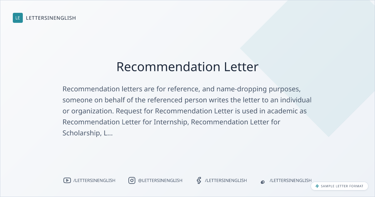 Recommendation letters are for reference, and name-dropping purposes, someone on behalf of the referenced person writes the letter to an individual or organization. Request for Recommendation Letter is used in academic as Recommendation Letter for Internship, Recommendation Letter for Scholarship, Letter of Recommendation for Higher Studies, Letter of Recommendation from Professor for Masters Degree and also in Business Deals, Visa Purpose, Government Proposals, etc.