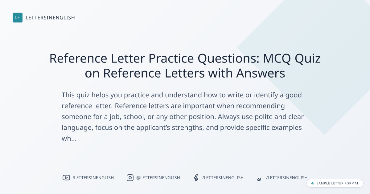 This quiz helps you practice and understand how to write or identify a good reference letter. Reference letters are important when recommending someone for a job, school, or any other position. Always use polite and clear language, focus on the applicant’s strengths, and provide specific examples when possible. Avoid adding irrelevant details or being negative. The key is to make the letter professional and positive while showing genuine support for the applicant.