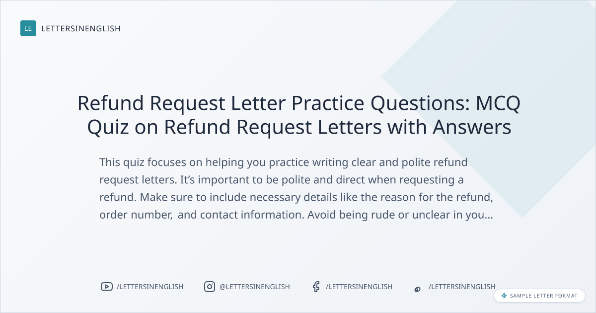 This quiz focuses on helping you practice writing clear and polite refund request letters. It’s important to be polite and direct when requesting a refund. Make sure to include necessary details like the reason for the refund, order number, and contact information. Avoid being rude or unclear in your letter. Being polite and respectful will help you get a positive response.