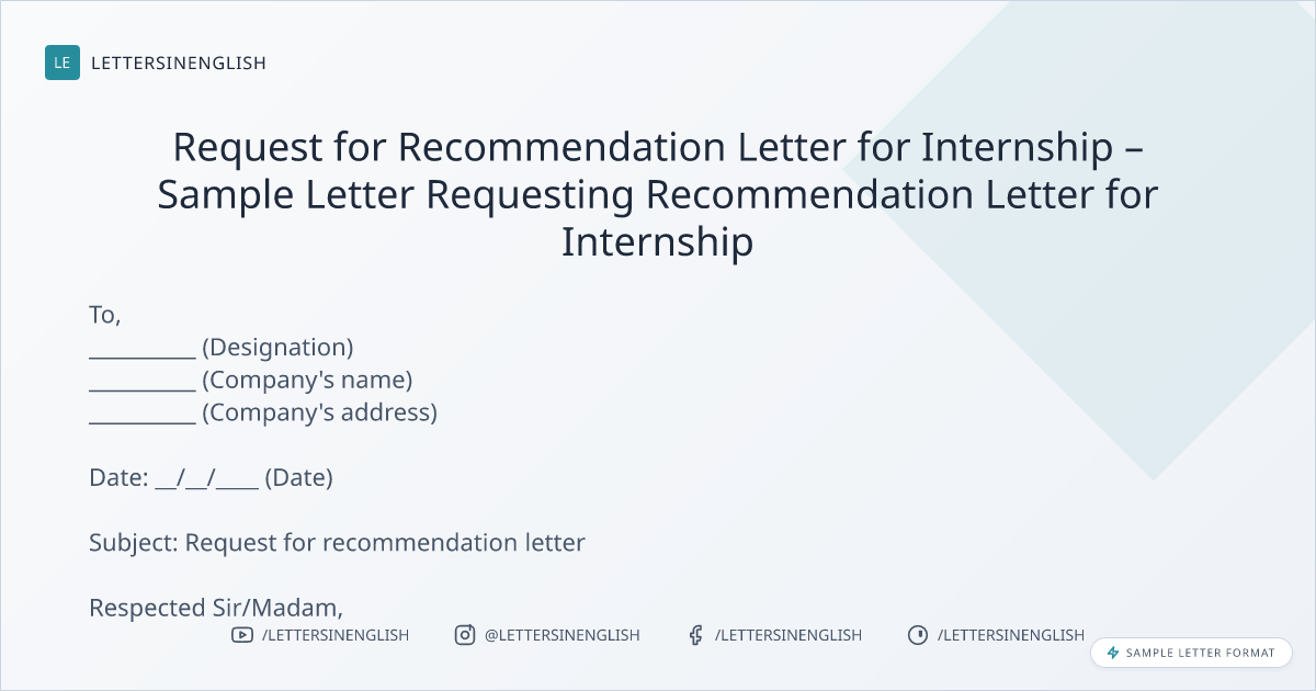 With due respect, my name is ___________ (name) and I am in the process of submitting my application for the internship as a ___________ (position) at ___________ (name of the organization). For the same, I require a letter of recommendation from someone _________ (mention requirements – who can elaborate on my working skills and academic qualifications – if applicable) and I believe that you can provide me with an honest and detailed recommendation for my internship.