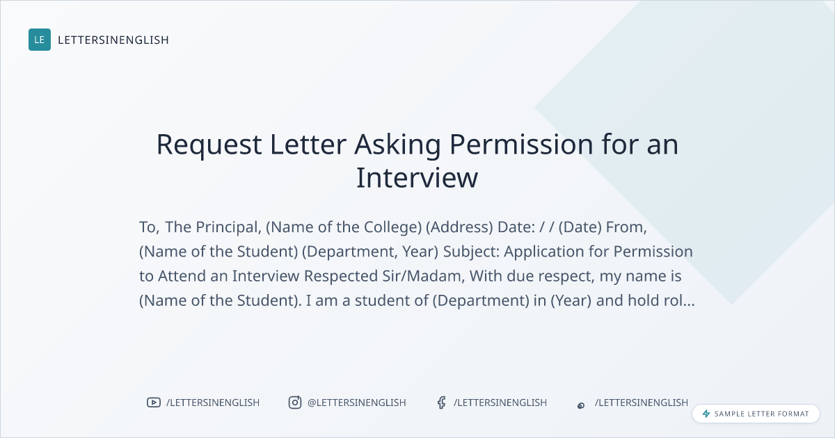 This letter is in regard to a permission; to attend an interview as per call letter received from ______________ (Company Name/Institution Name). I write to ask for humble permission to attend this interview. I would like to keep you notified that I would not be in college during the time of the interview.