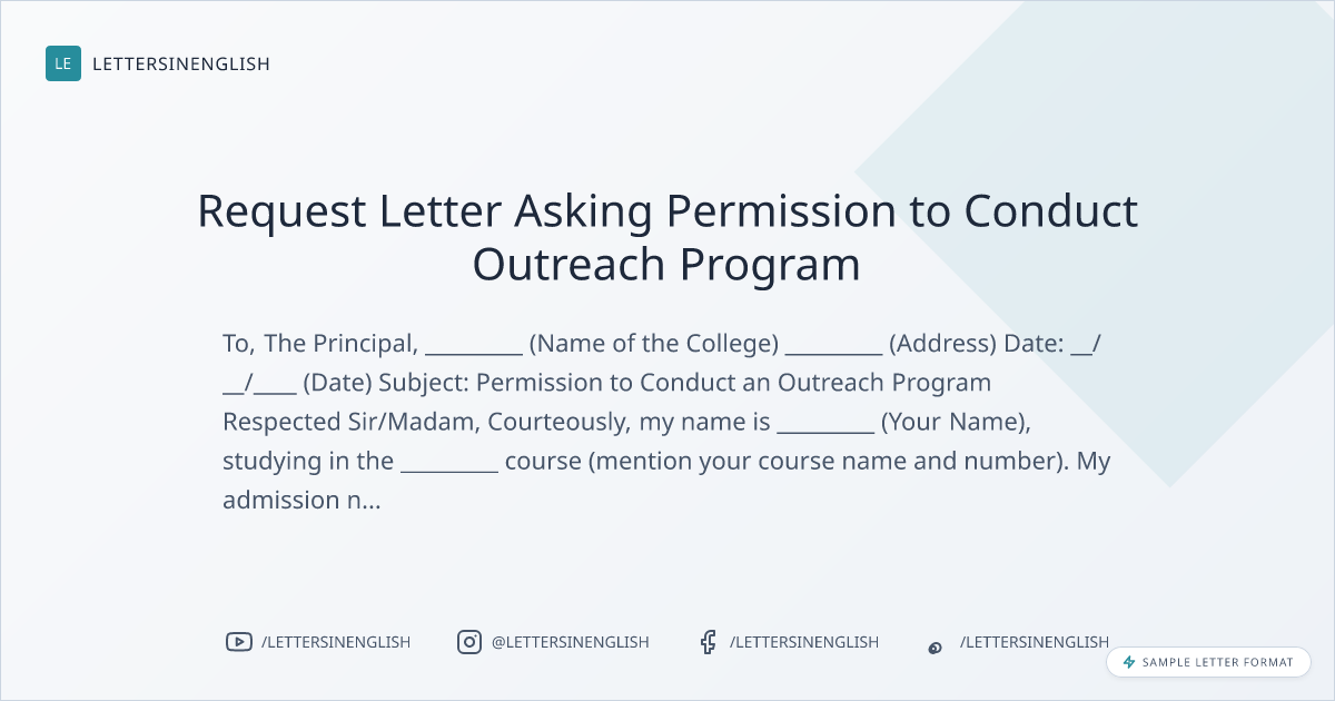 I am writing this letter to seek permission to conduct an outreach program on _________ (Mention topic) on __/__/____ (Mention date). This program will help the students of our college to understand a world they have never seen. This program would help in character building and their personal growth. Not only students but the faculties and staff of our college can also take part in this program.