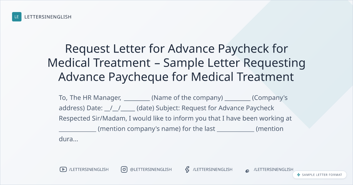 Request Letter for Advance Paycheck for Medical Treatment – Sample Letter Requesting Advance Paycheque for Medical Treatment