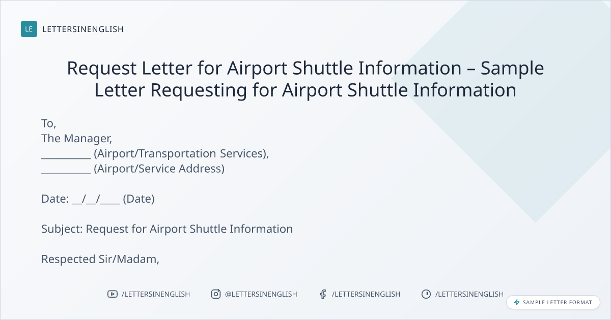 Respectfully, I am writing this letter to request information regarding the airport shuttle service. My name is __________ (Your Name), and I will be traveling from your airport on __/__/____(Date).