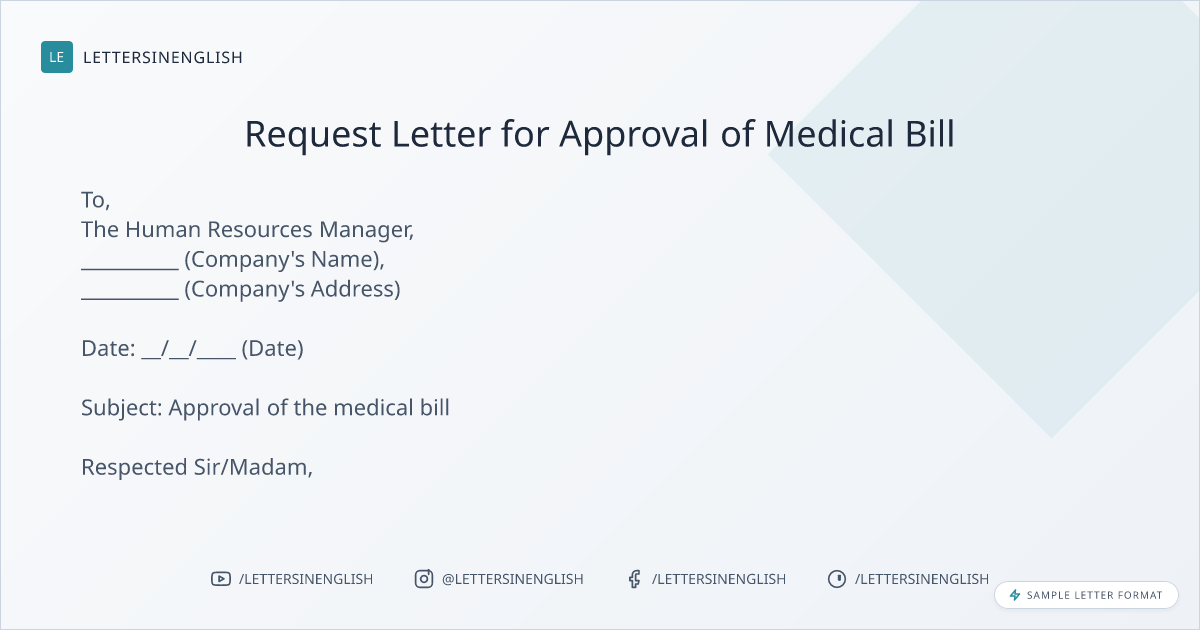 I would inform you that I am suffering from ________ (Disease) and I am prescribed medicines bearing a monthly bill of __________ (Amount). I am most respectfully writing this letter to request for approval of reimbursement of the medical bill as per my eligibility criteria. I am attaching a copy of the invoice for medicines.