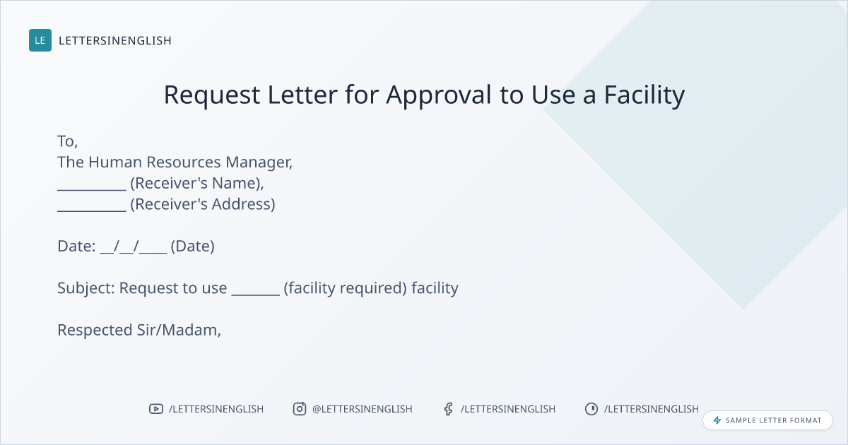 I am most respectfully and humbly writing this letter to you in order to seek your permission to use/ utilize _______ (Facility name – Sports arena/ Gym equipments/ Computer drives/ Any other) on __/__/____ (Date) for __________ (Purpose). I take complete responsibility for the facility that I use. In case of loss/ damage of any equipment, I shall be held liable for repayment of the damaged property. This shall be highly helpful if you could approve the same at the earliest.