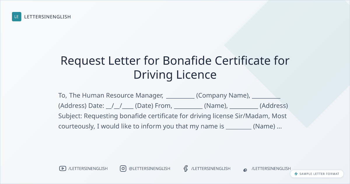 I am writing this letter to request you for issuing a bonafide certificate in my name required for the issuance of a driving license purpose. I have to submit the same by __/__/____ (Date). It is requested to kindly mention my ________ (name, address, designation, any other details required) in the requested document.