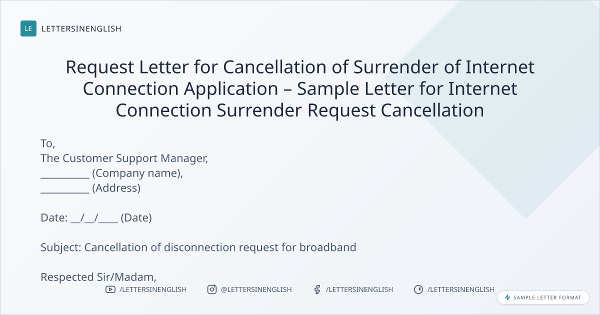 Request Letter for Cancellation of Surrender of Internet Connection Application – Sample Letter for Internet Connection Surrender Request Cancellation