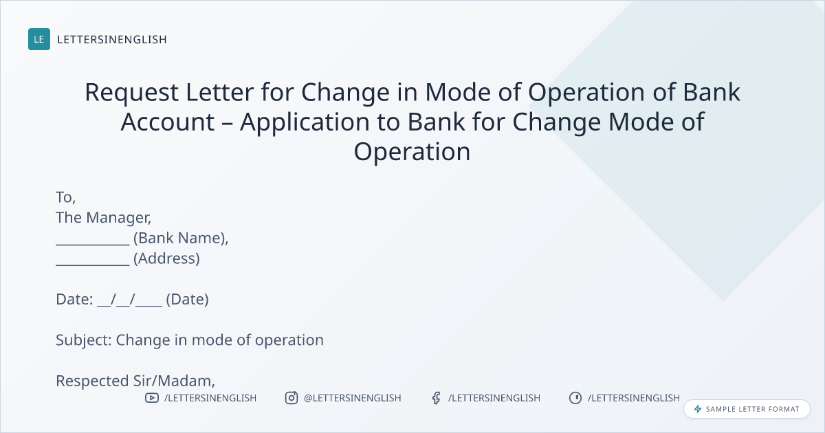 Request Letter for Change in Mode of Operation of Bank Account – Application to Bank for Change Mode of Operation