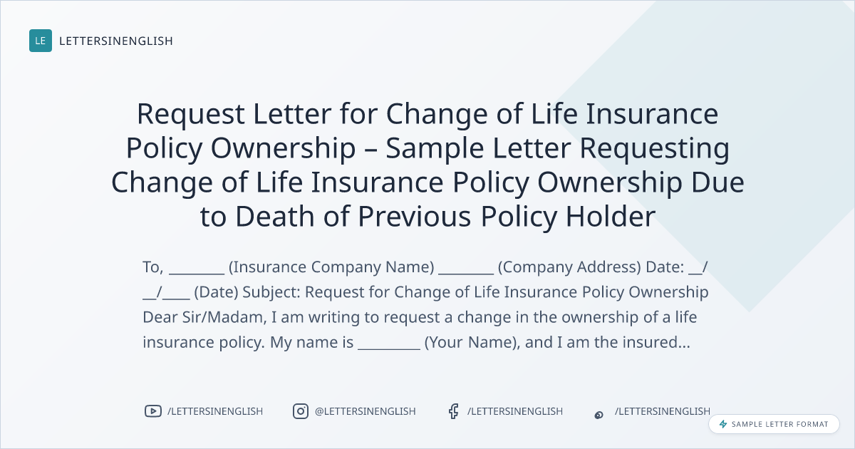 I am writing to request a change in the ownership of a life insurance policy. My name is _________ (Your Name), and I am the insured under the policy with policy number _________ (Policy Number). The previous policy holder, ________ (Name of Previous Policy Holder), has unfortunately passed away.