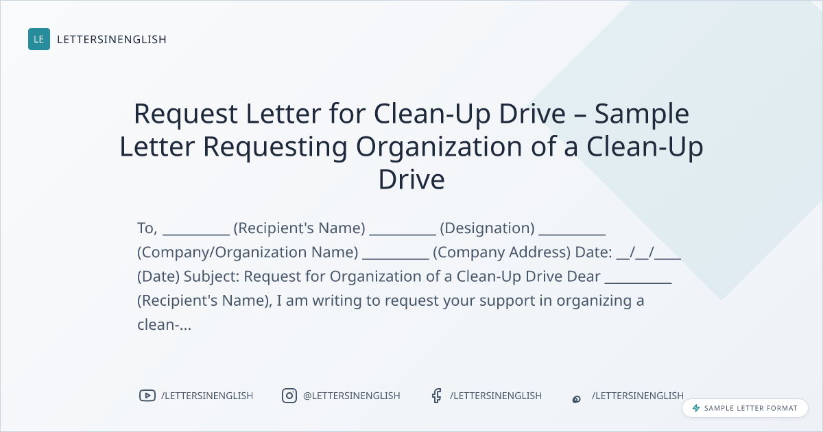 I am writing to request your support in organizing a clean-up drive in __________ (Specify Location). This initiative aims to promote cleanliness and raise awareness about maintaining a clean environment within our community.