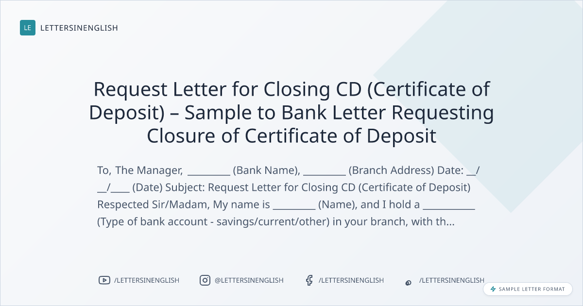 Request Letter for Closing CD (Certificate of Deposit) – Sample to Bank Letter Requesting Closure of Certificate of Deposit