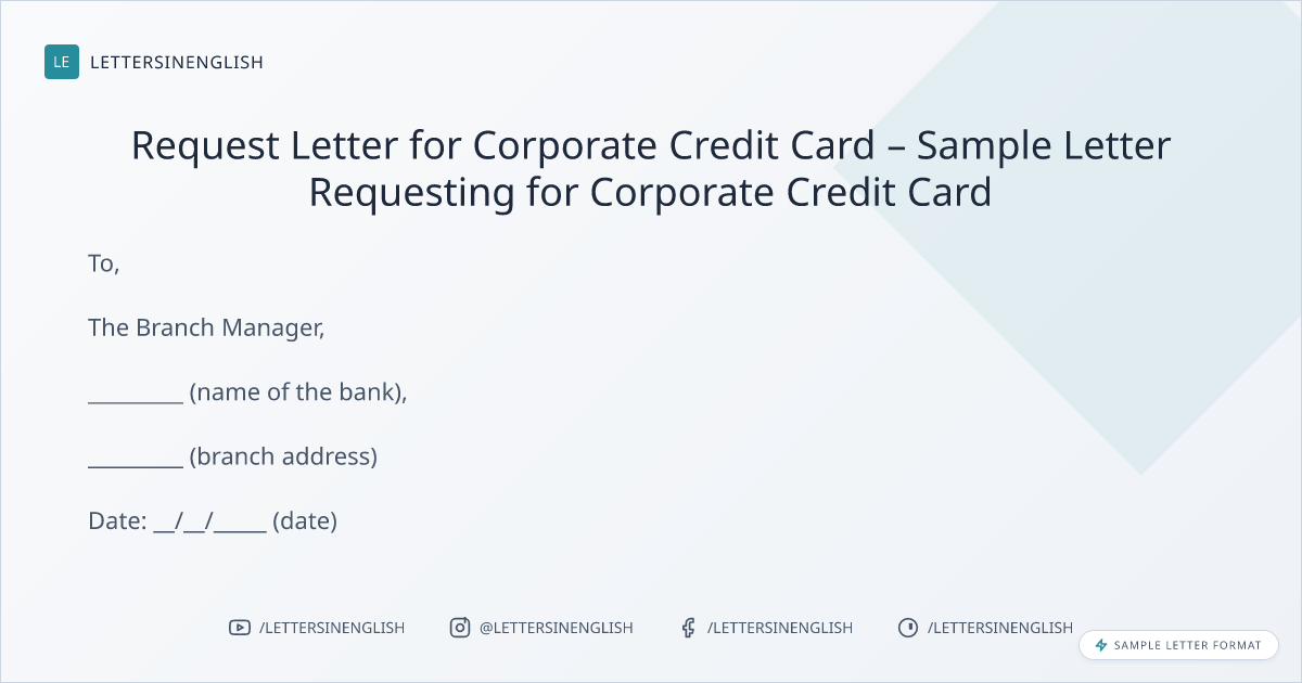 My name is ___________ (name), and I am writing this letter to request your guidance in the process of applying for a corporate credit card in my name. I have been employed at _______ (name of the company) for the last ________ (mention duration). I recently learned about the corporate credit card offered by your bank and I am eager to proceed with all the necessary formalities and documentation.