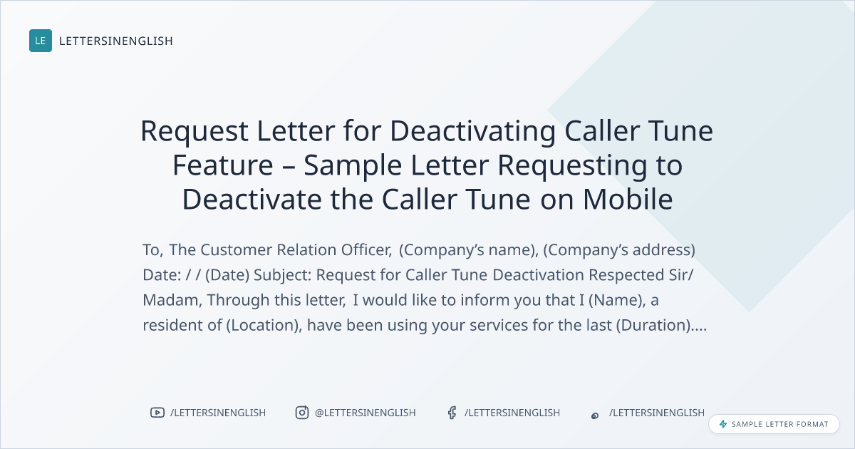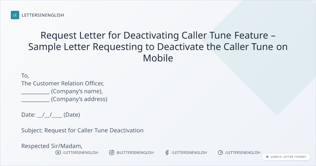 Request Letter for Deactivating Caller Tune Feature – Sample Letter Requesting to Deactivate the Caller Tune on Mobile