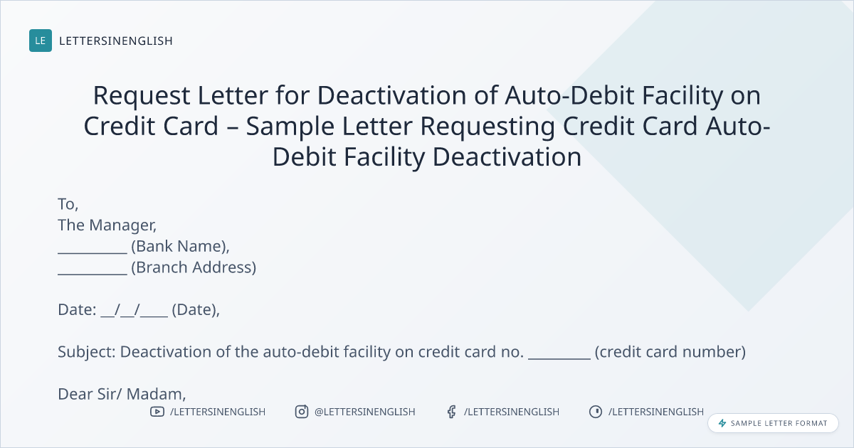 Request Letter for Deactivation of Auto-Debit Facility on Credit Card – Sample Letter Requesting Credit Card Auto-Debit Facility Deactivation