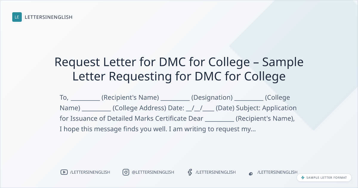 I am writing to request my Detailed Marks Certificate (DMC) for __________ (Course Name), which I completed in __________ (Year). I require the DMC for __________ (Purpose – higher studies/job application).