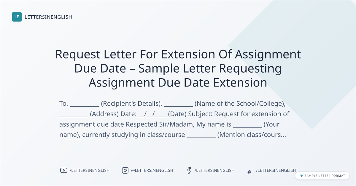 I am writing this letter to request you to kindly extend the assignment due date of subject __________ (Mention subject name). The date of the submission was __________ (mention date). I request you to extend the date to __________ (mention revised date). The reason behind the same is __________ (Mention the reason for extension).