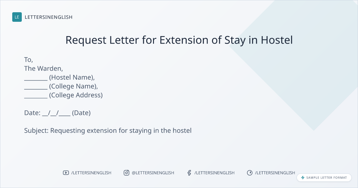 I am most respectfully writing this letter in order to request you for allowing me to stay at your hostel for ________ (Number of days). Respected, my contract ends on __/__/____ (Date) but due to ________ (Reason – not well/ no conveyance available/ luggage not packed/ any other) I will not be able to vacate your property on the mentioned date.