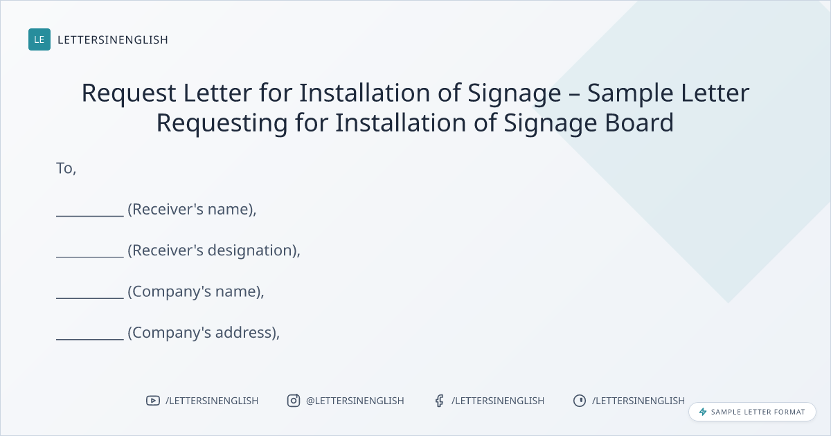 I am writing this letter to formally request the installation of a signage board at _________ (name/ address of the industry). The purpose of this signage board is to ___________ (assist our guests in identifying our company/safety/as per rules/other). I have provided the specifications for the signage board below: