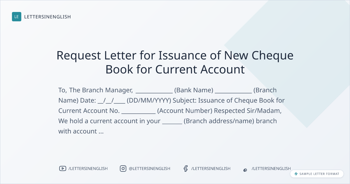 Sample Letter for Issuance of New Cheque Book for Current Account - Cheque Book Request Letter for Current Account