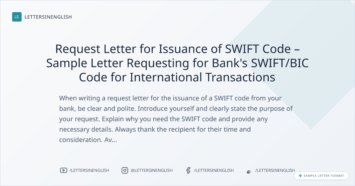 When writing a request letter for the issuance of a SWIFT code from your bank, be clear and polite. Introduce yourself and clearly state the purpose of your request. Explain why you need the SWIFT code and provide any necessary details. Always thank the recipient for their time and consideration. Avoid unclear language and ensure all essential information is included.