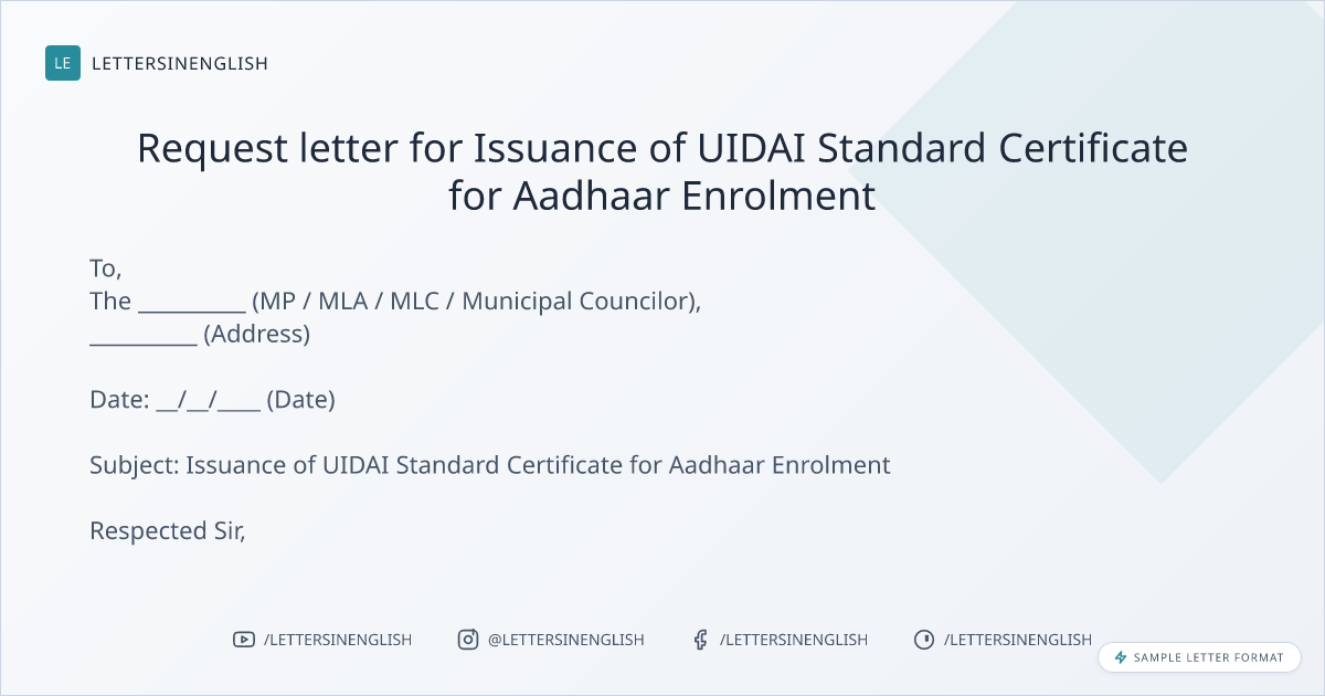 Request Letter for UIDAI Standard Certificate for Aadhaar Enrolment