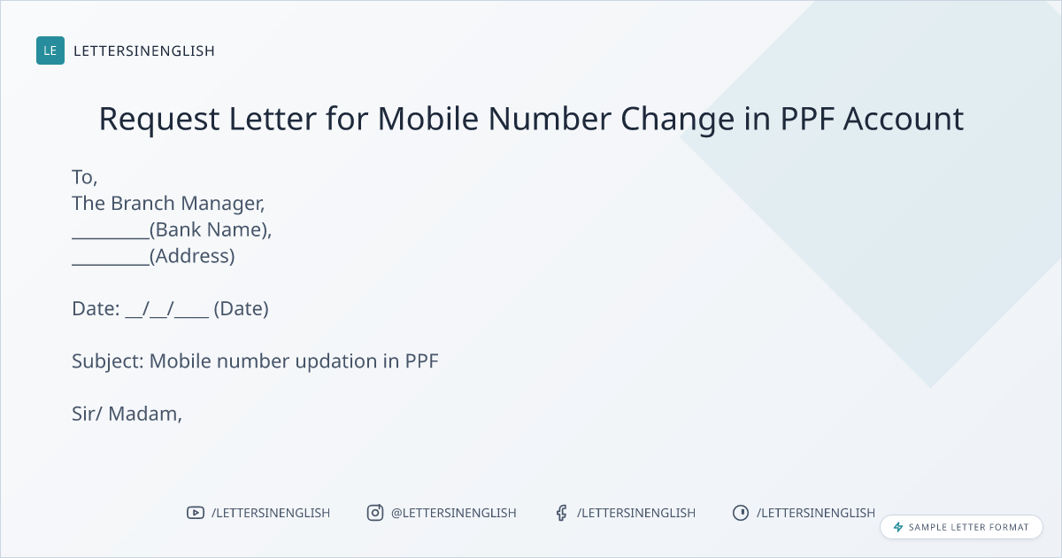 Respected, I am writing this letter to request you to kindly update my registered mobile number from _______ (previously registered number) to new mobile number ________ (mobile number) in my PPF account as my previous number got __________ (Lost/ Misplaced/ Not available/ Any other – Mention reason).