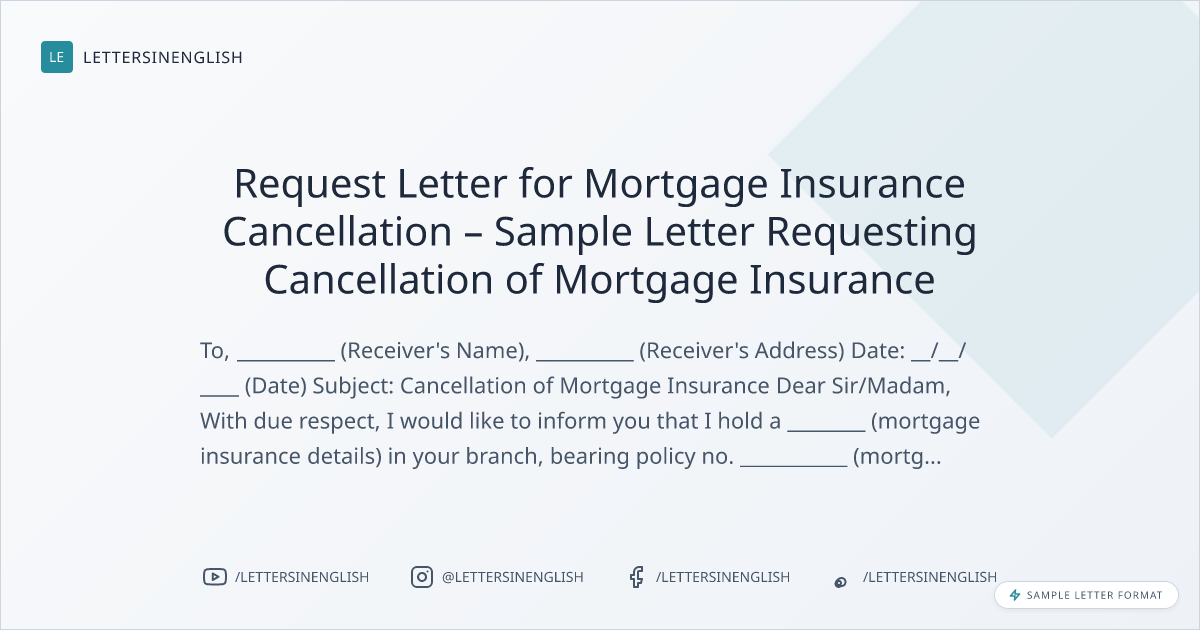 I am writing this letter in regard to the cancellation of the above-mentioned mortgage insurance. The reason for cancellation of mortgage insurance __________ (mention reason for cancellation). I request you to kindly guide me through the procedure in this regard. I shall be highly obliged for your kind response. In case of any queries, you may contact me at __________ (contact number).