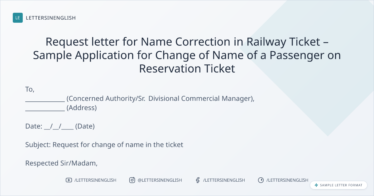 Sample Request Letter for change of name in the ticket
