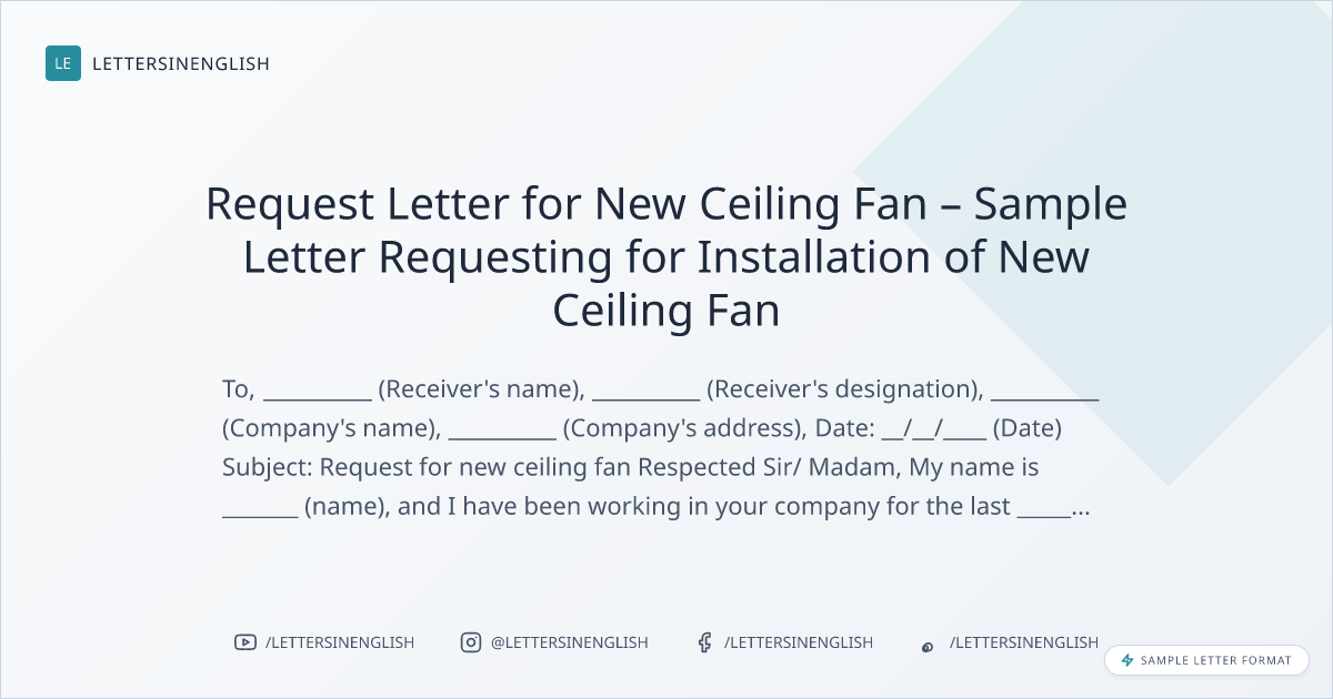 I am writing this letter with utmost respect to request the installation of a new ceiling fan at the ____________ (office/seminar hall/meeting room/corridor/labs/any other). Currently, ________ (there are no fans installed or the installed fan is not working) in the mentioned area, which causes discomfort and suffocation for the employees. Installing a ceiling fan will help control the temperature, improve ventilation and air circulation.