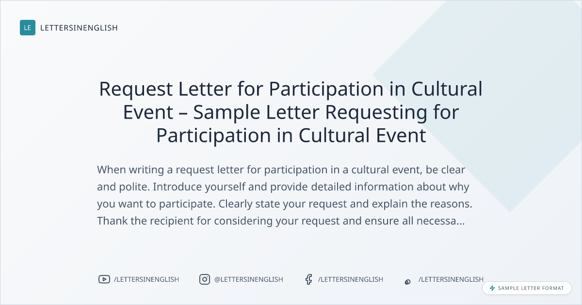 When writing a request letter for participation in a cultural event, be clear and polite. Introduce yourself and provide detailed information about why you want to participate. Clearly state your request and explain the reasons. Thank the recipient for considering your request and ensure all necessary information and documents are included.