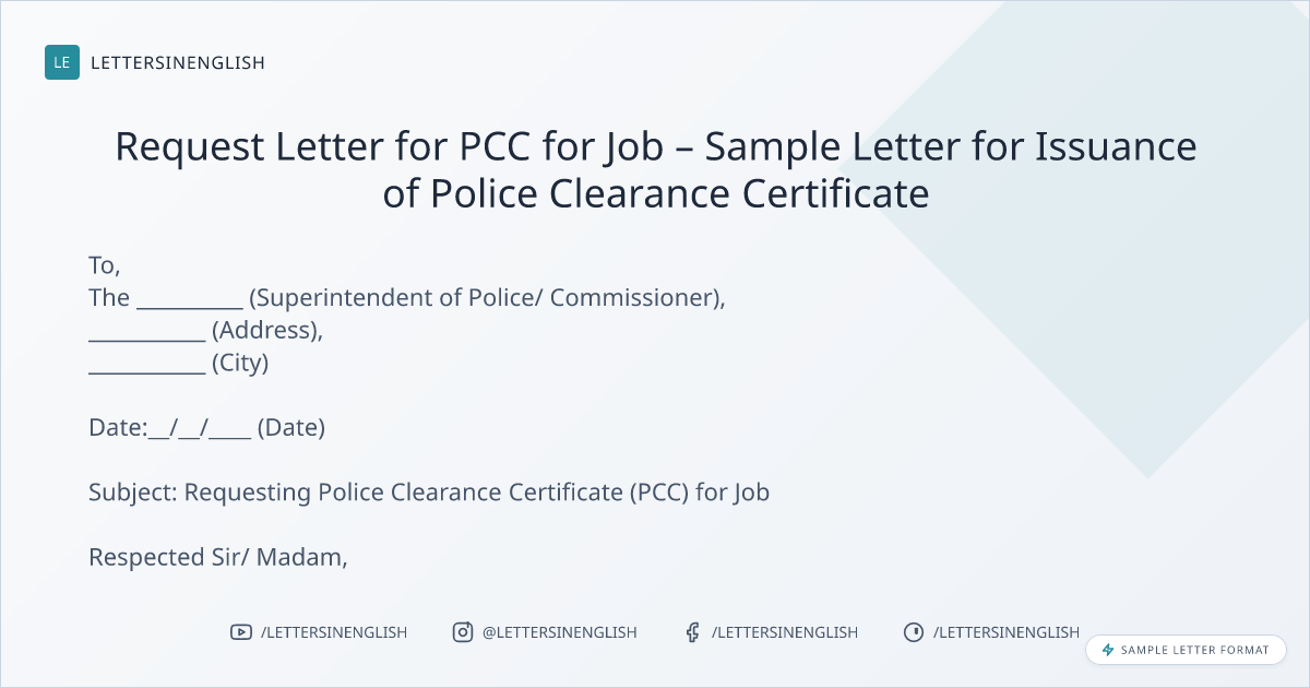 Most respectfully, I __________ (Name), S/o, W/o, D/o , ____________ write this letter to request you for issuance of Police Clearance Certificate in my name. I would like to inform you that I am a resident of ____________ (Address) and I am in need of the PPC for job purpose.