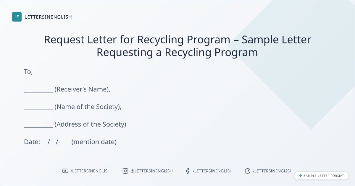 Through this letter, I want to inform you that on behalf of _________ (society name), I request you to kindly schedule a recycling program at the society. The main reason for the same is _______ (mention purpose).