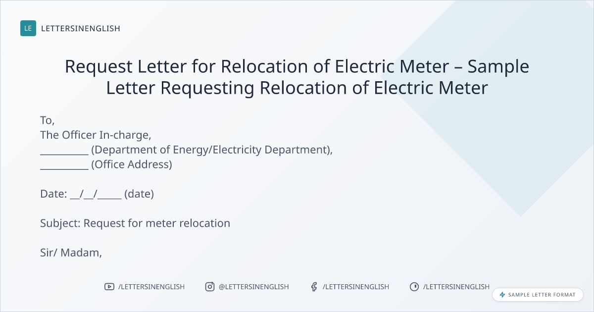 Respected, this is to bring into your consideration that I am willing to relocate my _____ (energy/electricity) meter to the ________ (mention location) as ____________ (mention purpose – renovation/ reconstruction/ any other). This is to request you to kindly consider relocating the meter to a new location.