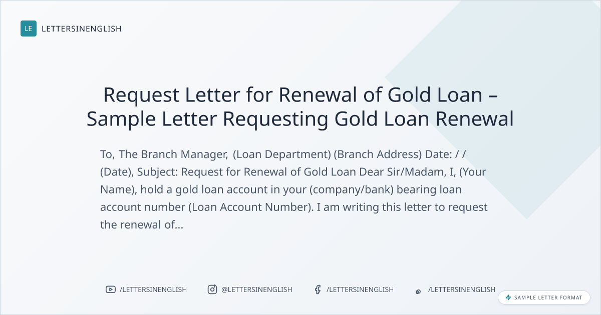 I, _________ (Your Name) hold a gold loan account in your ________ (company/ bank) bearing loan account number ____________ (Loan Account Number). I am writing this letter to request for renewal of the gold loan with the details mentioned below: