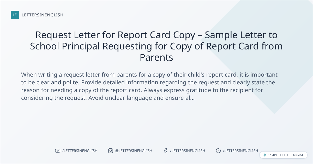 When writing a request letter from parents for a copy of their child’s report card, it is important to be clear and polite. Provide detailed information regarding the request and clearly state the reason for needing a copy of the report card. Always express gratitude to the recipient for considering the request. Avoid unclear language and ensure all necessary details are included.