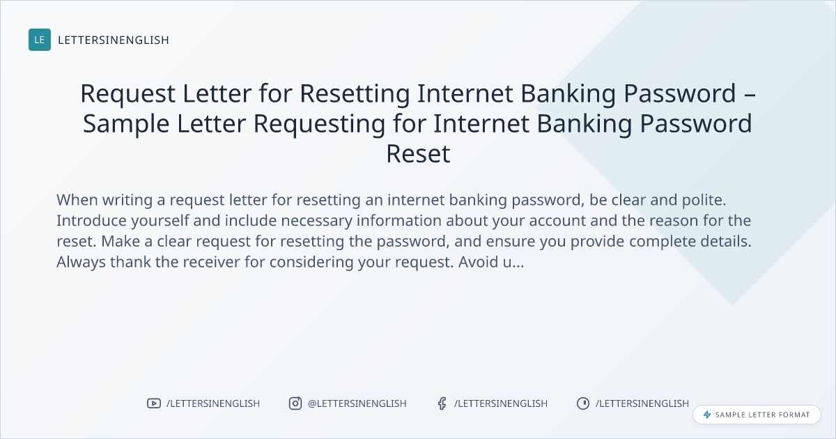 When writing a request letter for resetting an internet banking password, be clear and polite. Introduce yourself and include necessary information about your account and the reason for the reset. Make a clear request for resetting the password, and ensure you provide complete details. Always thank the receiver for considering your request. Avoid unclear language and make sure to include all necessary information.
