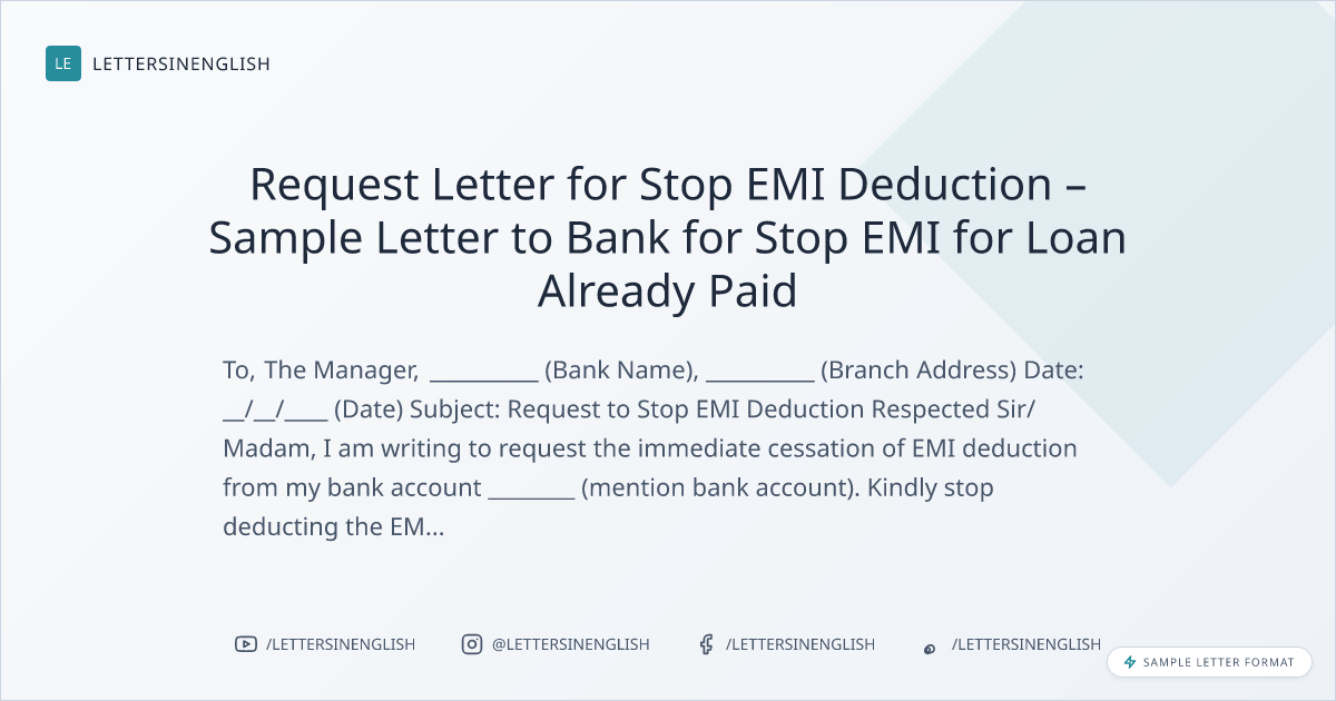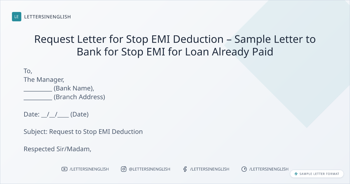 Request Letter for Stop EMI Deduction – Sample Letter to Bank for Stop EMI for Loan Already Paid