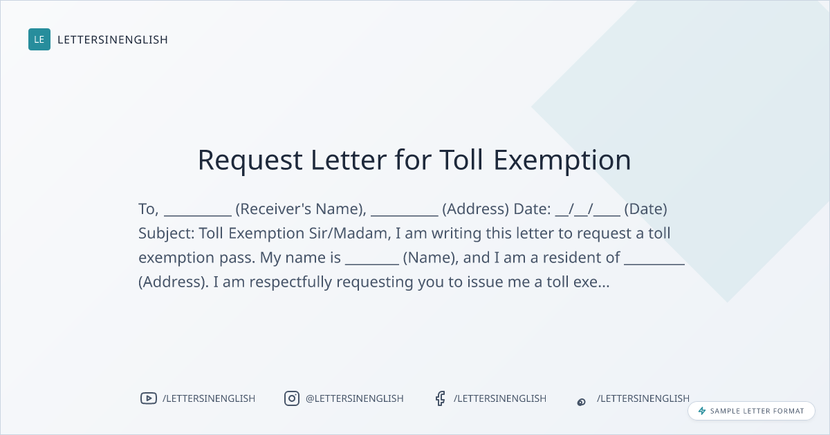 My name is ________ (Name) and I am a resident of _________ (Address) and I am most respectfully writing this letter to request you for toll pass. I would like to inform you that I am eligible for toll exemption as ___________ (Mention toll exemption details). Therefore, I request you to kindly issue me a toll exemption pass.