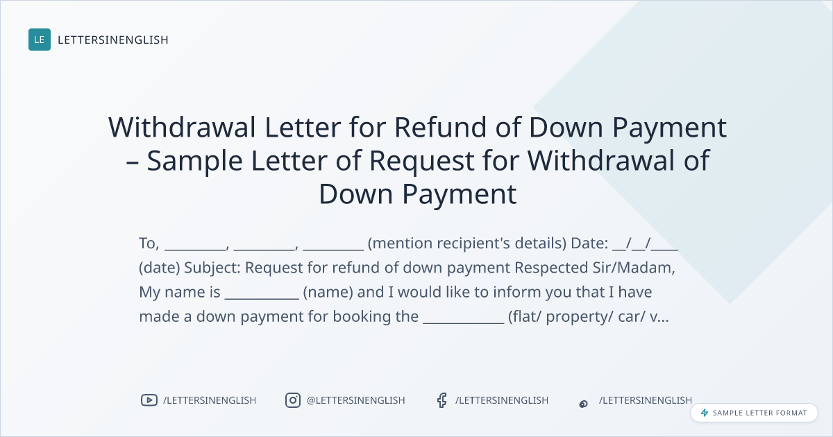 Withdrawal Letter for Refund of Down Payment – Sample Letter of Request for Withdrawal of Down Payment