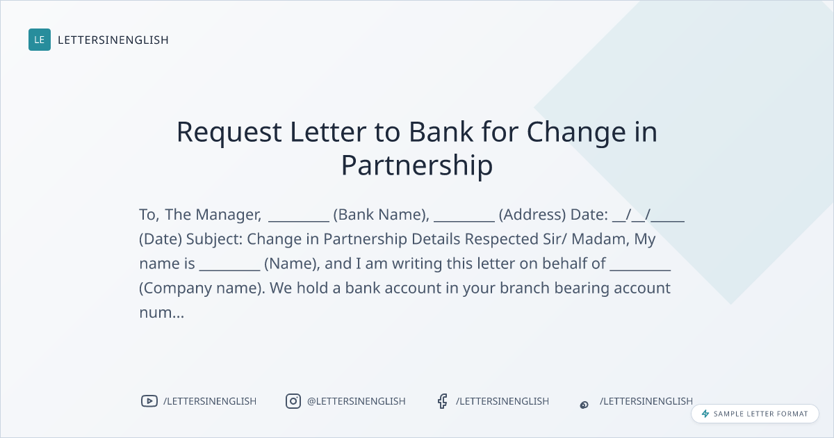 We would like to inform you that we hold a bank account in your branch bearing account number __________ (Account Number). This is to inform you that the partner of our firm has been changed from ____________ (Partner Name) to ___________ (Partner Name), __________ (Designation). We write this letter to request you to guide us on the procedure for updating the details of the new partner.