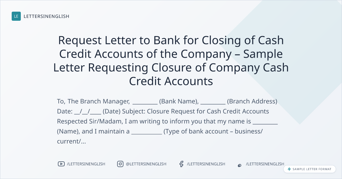 Request Letter to Bank for Closing of Cash Credit Accounts of the Company – Sample Letter Requesting Closure of Company Cash Credit Accounts