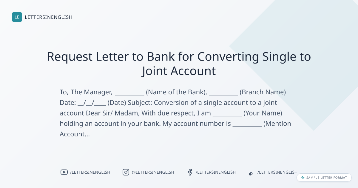 This letter is to request you to kindly convert my single account to a joint account by adding the name of my __________ (relation – if any) __________ (Name) for reason __________ (Mention reason – if applicable).