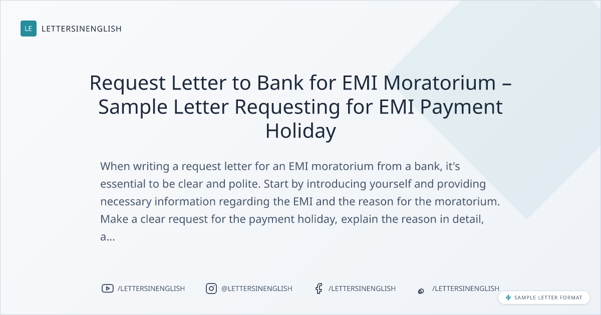 When writing a request letter for an EMI moratorium from a bank, it’s essential to be clear and polite. Start by introducing yourself and providing necessary information regarding the EMI and the reason for the moratorium. Make a clear request for the payment holiday, explain the reason in detail, and provide justification. Always thank the recipient for considering your request. Avoid unclear language and ensure all necessary information is included.
