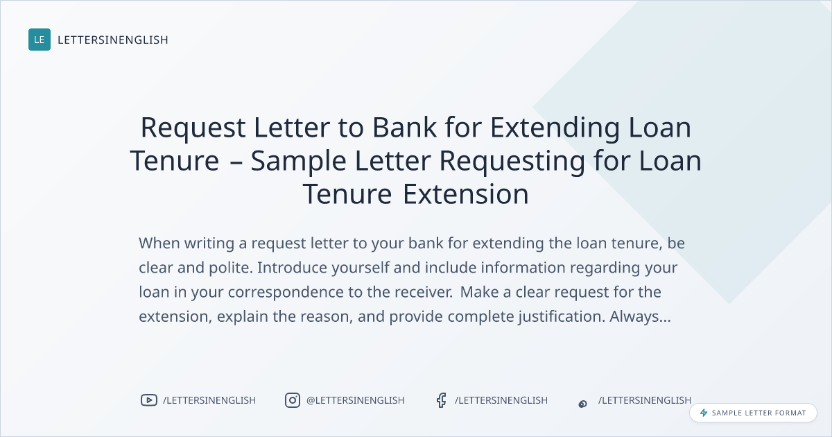 When writing a request letter to your bank for extending the loan tenure, be clear and polite. Introduce yourself and include information regarding your loan in your correspondence to the receiver. Make a clear request for the extension, explain the reason, and provide complete justification. Always thank the receiver for considering your request. Avoid unclear language and ensure all necessary information is included.
