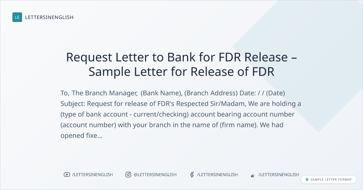 Request Letter to Bank for FDR Release – Sample Letter for Release of FDR