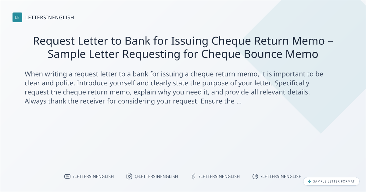 When writing a request letter to a bank for issuing a cheque return memo, it is important to be clear and polite. Introduce yourself and clearly state the purpose of your letter. Specifically request the cheque return memo, explain why you need it, and provide all relevant details. Always thank the receiver for considering your request. Ensure the language is clear and all necessary information is included to avoid any confusion.